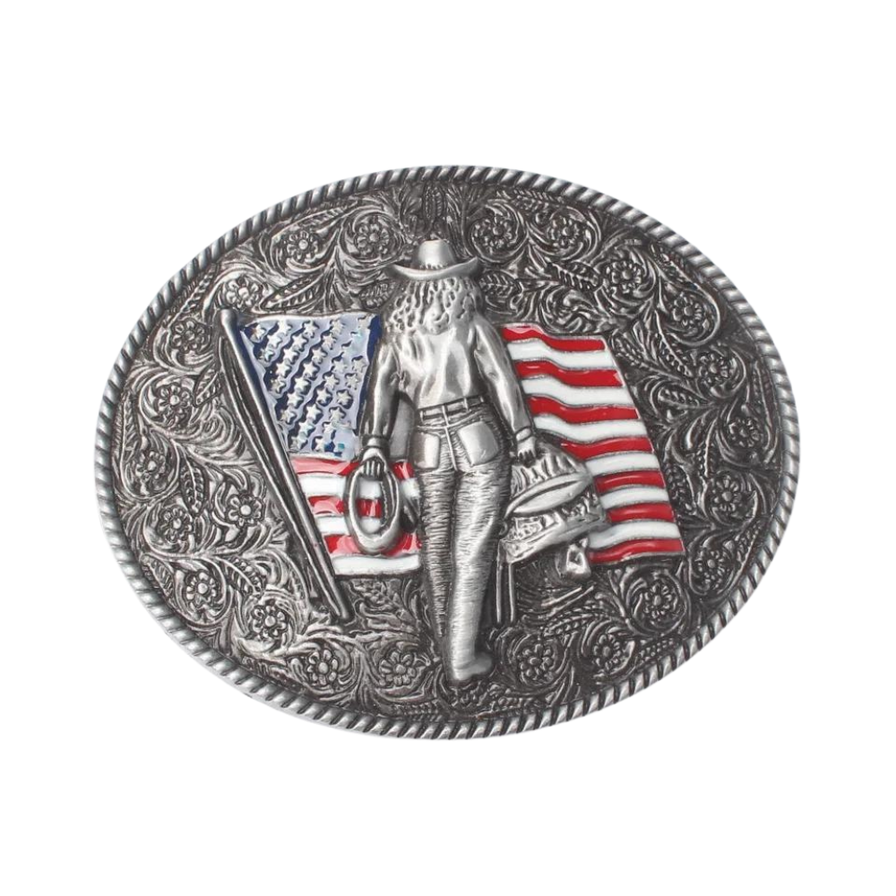 Amerikanische Cowgirl mit Flaggen-Gürtelschnalle – Ein Highlight für Westernfans und Stilbewusste