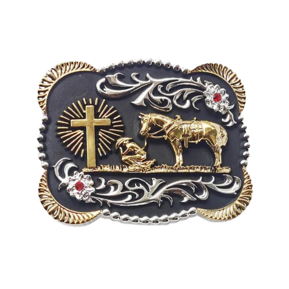 Die Cowboy Gebet Western Gürtelschnalle ist ein kunstvoll gestaltetes Schmuckstück, das den Geist des Wilden Westens und seinen tief verwurzelten Glauben eindrucksvoll widerspiegelt. Mit einer bewegenden Darstellung eines Cowboys, der vor einem Kreuz zusammen mit seinem Pferd kniet, wird diese Schnalle zu einem kraftvollen Statement – ein Symbol für Tradition, Überzeugung und den unerschütterlichen Western-Lifestyle. Durch ihr detailreiches Design, veredelt mit warmen, goldenen Akzenten und verspielten floralen Elementen, wird sie zum Blickfang in jeder Sammlung und passt gleichermaßen perfekt zu lässigen Outfits wie zu besonderen Anlässen.