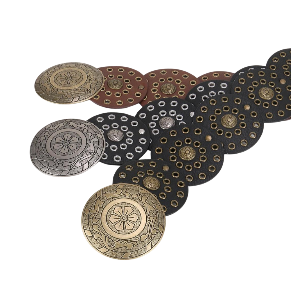 | Design | Breit, mit kreisförmiger Metallschnalle und markanten Details |