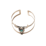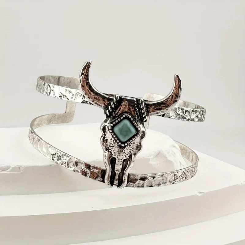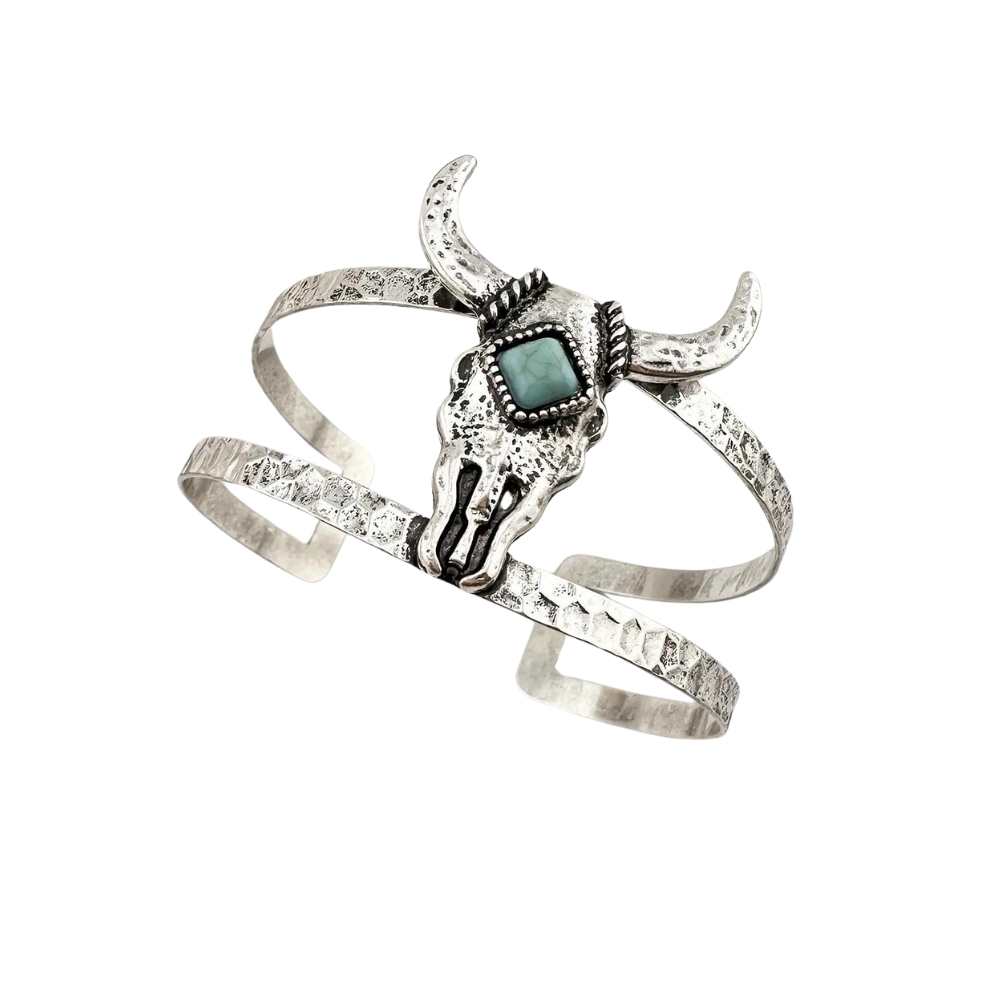Erleben Sie den Charme des Wilden Westens mit diesem markanten Bullen-Schädel Manschettenarmband, das Abenteuerlust und Freiheit verkörpert. Die exquisite Kombination aus zarter Silberbeschichtung und einem farbenfrohen Türkisstein verleiht diesem Schmuckstück das ideale Cowgirl-Flair. Dank des verstellbaren Designs passt das Armband perfekt an nahezu jedes Handgelenk und ist ein unverzichtbares Accessoire für Damen, die gerne ein gewagtes Statement setzen.