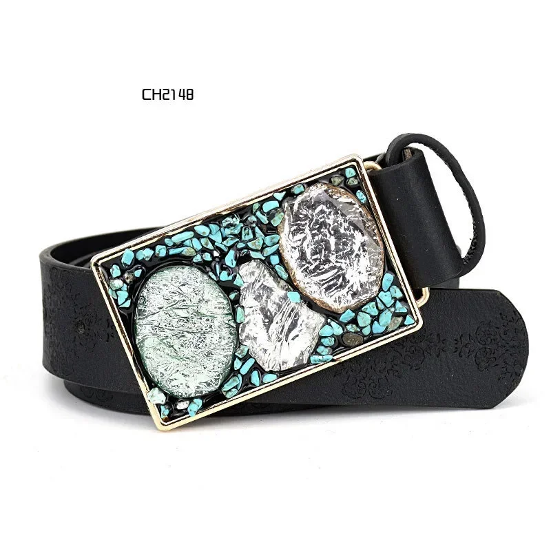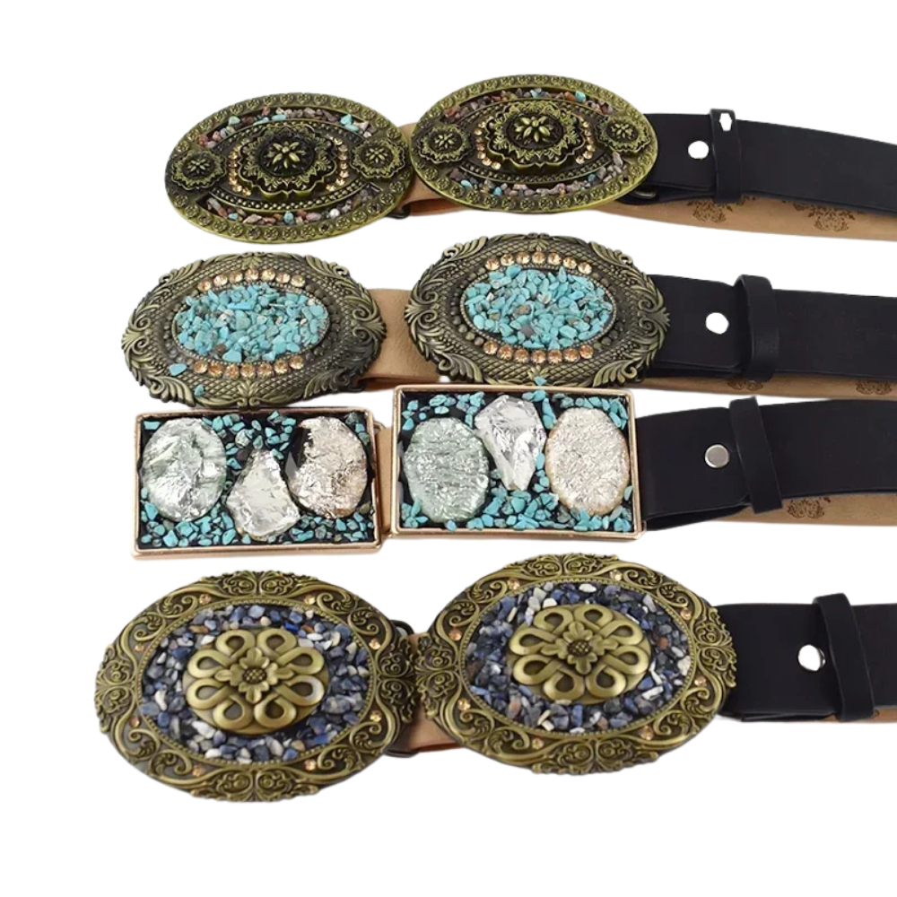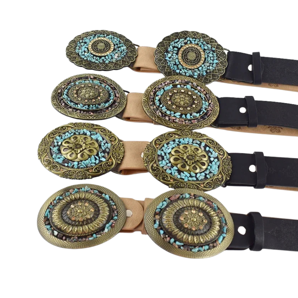 Die auffallende dekorative Schnalle beeindruckt nicht nur durch verschiedene Designs, sondern auch durch ihre Detailverliebtheit. Mit den Maßen von 9,5 cm Länge und 7,5 cm Breite unterstreicht sie den rustikalen Charme des Gürtels und garantiert gleichzeitig einen sicheren, bequemen Sitz. Kombinieren Sie ihn mit Jeans, Röcken oder Kleidern, um Ihrem Outfit einen Hauch von Vintage und zeitloser Eleganz zu verleihen.