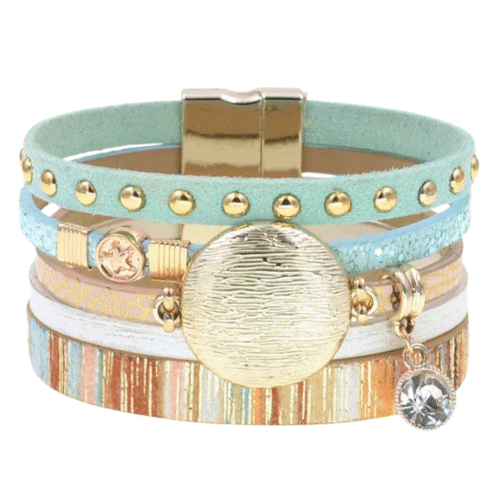 Das mehrlagige Design beeindruckt durch variierende Texturen, metallische Details und lebendige Farbakzente, die das Armband zu einem echten Blickfang machen. Die harmonische Verbindung von klassischen Western-Elementen und modernen Designelementen wie metallischen Charms sorgt für einen zeitgemäßen und dennoch authentischen Look. Der praktische magnetische Verschluss garantiert nicht nur einen sicheren Halt, sondern auch einen hohen Tragekomfort.