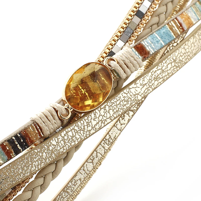 Dieses exquisite, mehrschichtige Lederarmband für Damen vereint rustikalen Charme mit modernem Design und verleiht deinem Outfit einen Hauch von Boho-Chic. Das Highlight bildet der funkelnde Kristallanhänger, der sich harmonisch vom kunstvoll geflochtenen und geschmeidigen PU-Leder abhebt. Sorgfältig mit Liebe zum Detail gefertigt, unterstreicht dieses einzigartige Schmuckstück deinen individuellen Stil und ist ein absolutes Must-have für jede modische Garderobe.