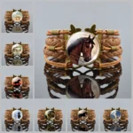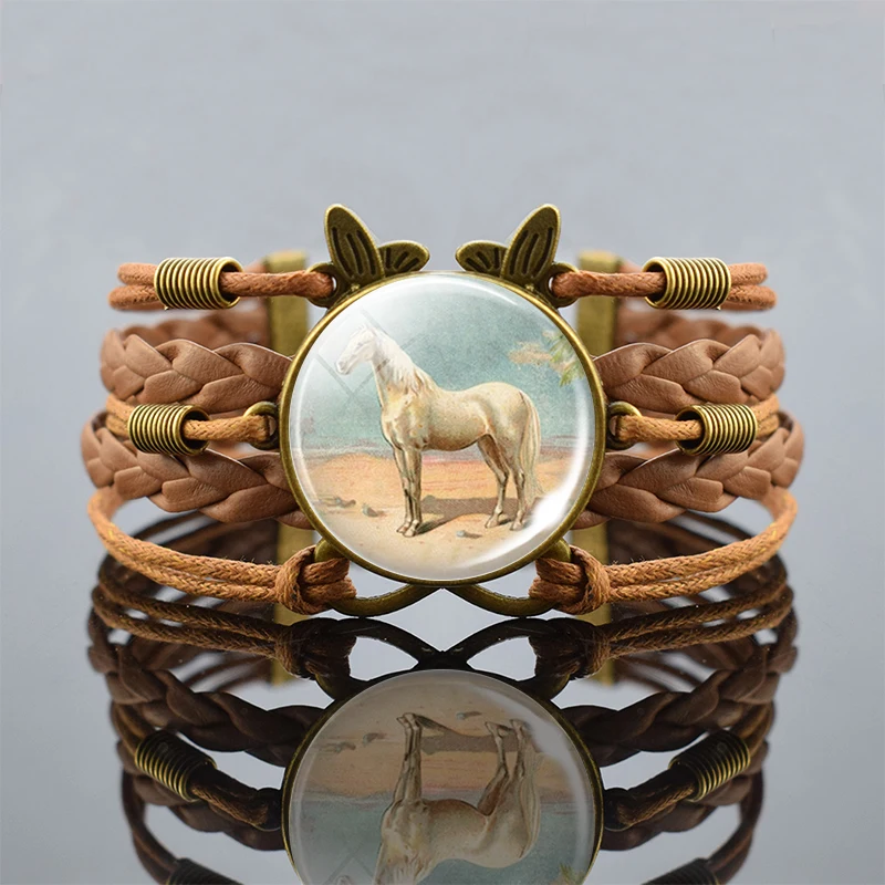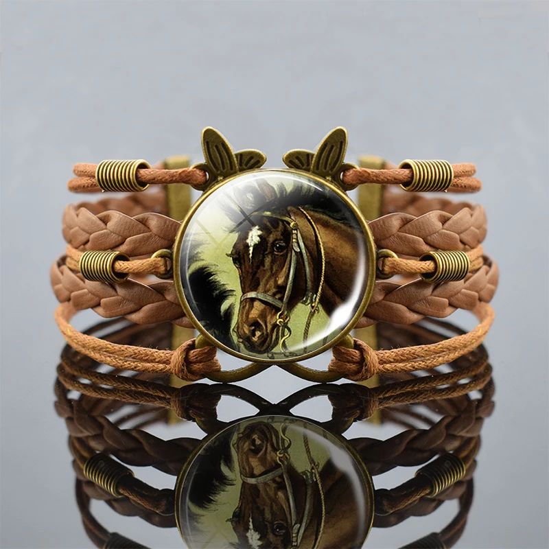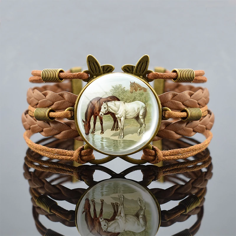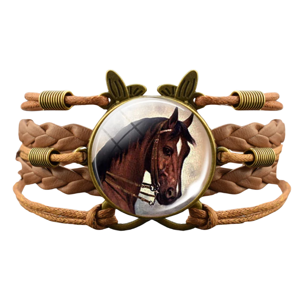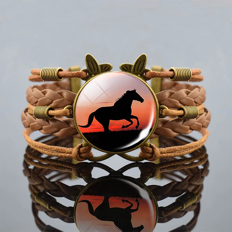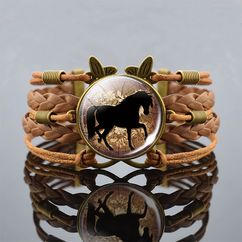 Die handgefertigten, vintage geflochtenen Bänder verleihen dem Armband eine natürliche, rustikale Ausstrahlung, die perfekt mit dem markanten Pferdeanhänger harmoniert. Feine Kupferdetails und ein edles Glas-Cabochon unterstreichen das beeindruckende Pferdemotiv, das die traditionsreiche Kultur der amerikanischen Prärie widerspiegelt. Ob auf Festivals, Rodeos oder als stilvolles Accessoire im Alltag – dieses Armband ist die ideale Wahl für modebewusste Frauen, die den Western-Spirit lieben.