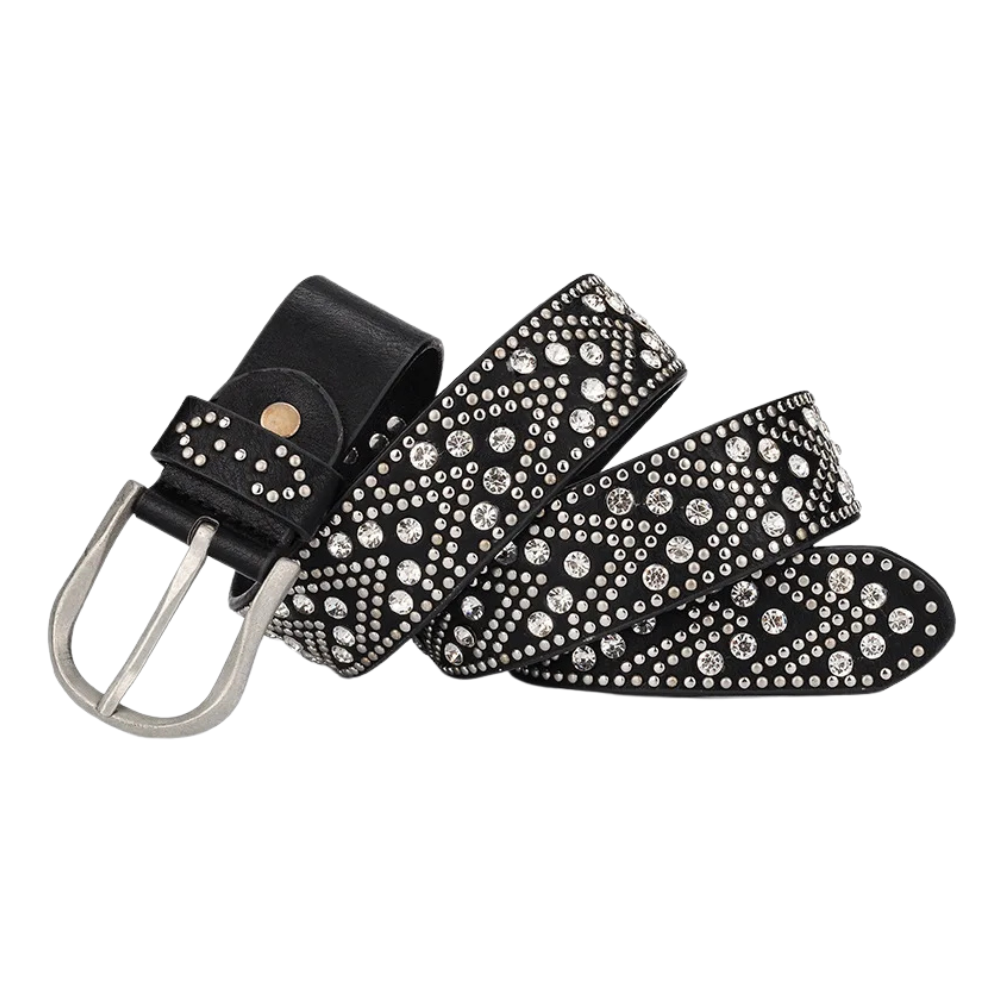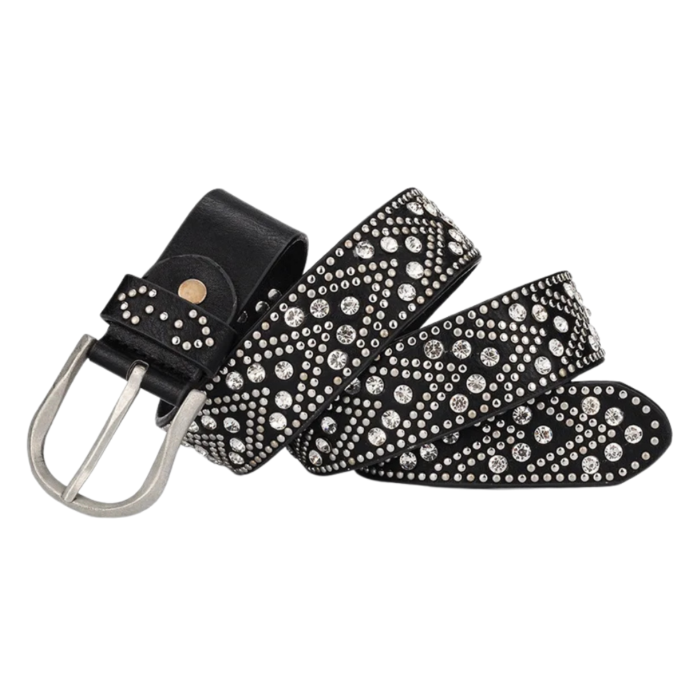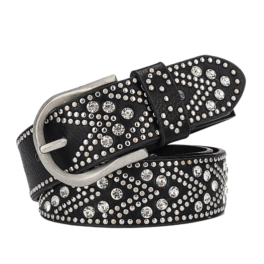 Entdecken Sie diesen modernen Damen-Westerngürtel, der den klassischen Westernstil mit funkelnden glamourösen Akzenten vereint. Funkelnde Strasssteine kombiniert mit robusten Metallnieten in eleganten geometrischen Mustern machen diesen Gürtel zu einem echten Blickfang und verleihen Ihrem Outfit einen Hauch von zeitlosem Glamour.