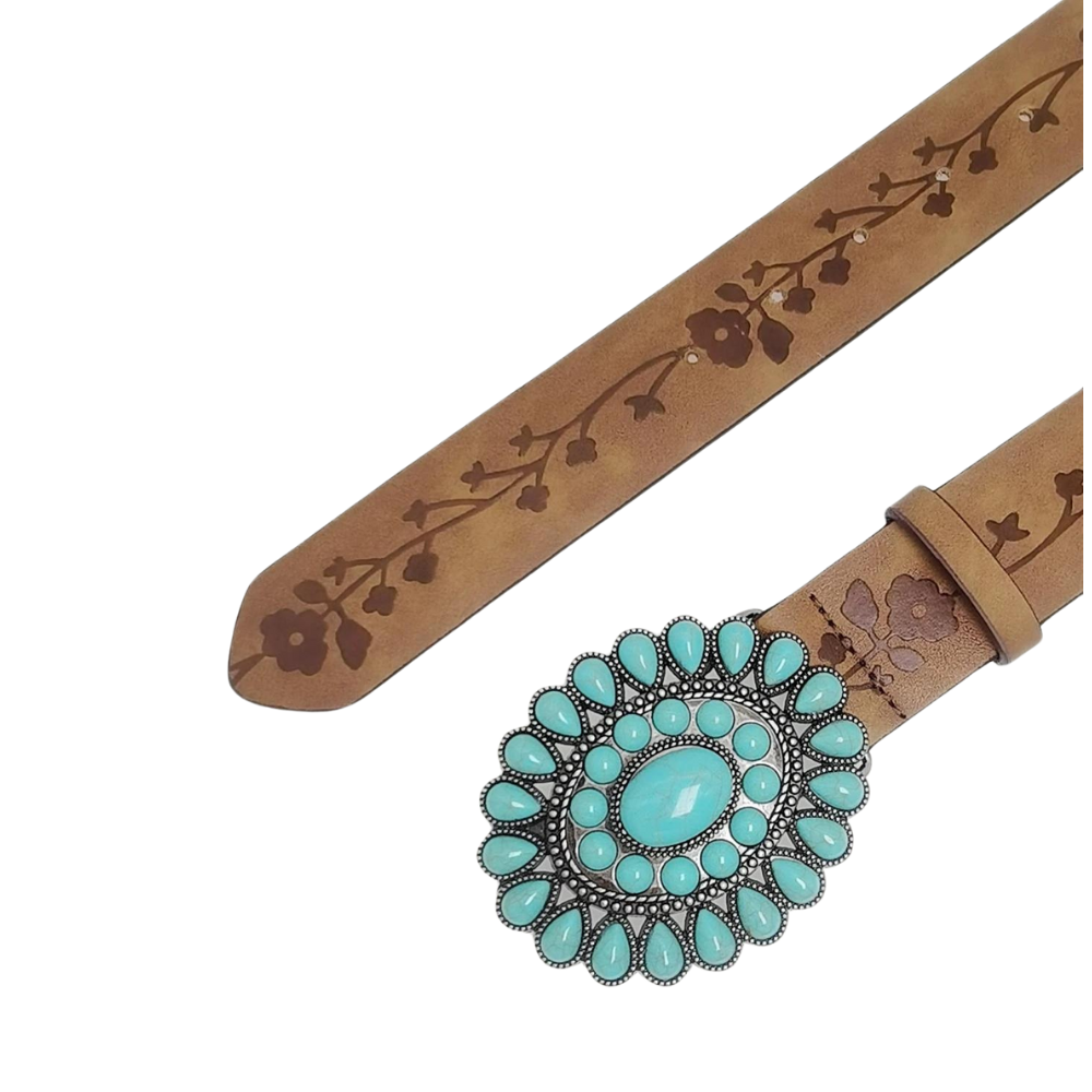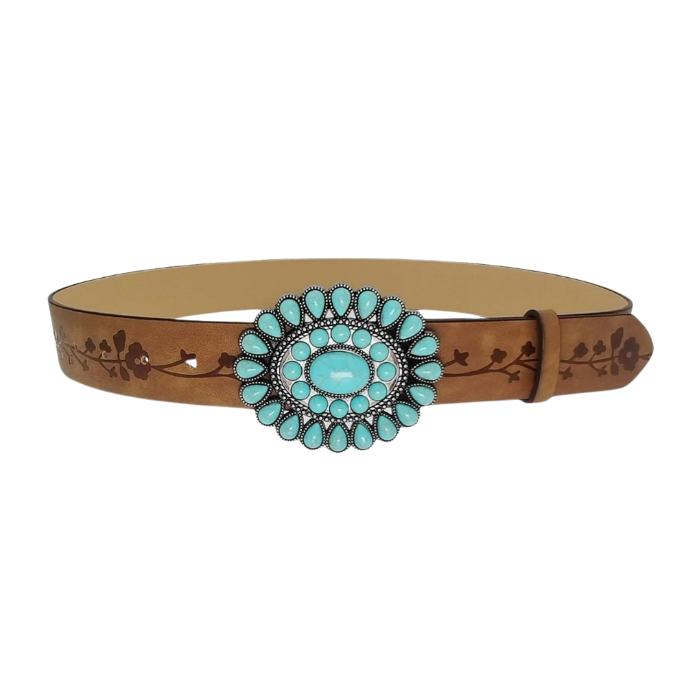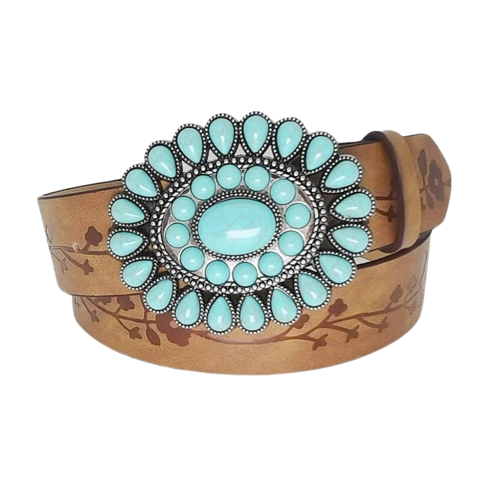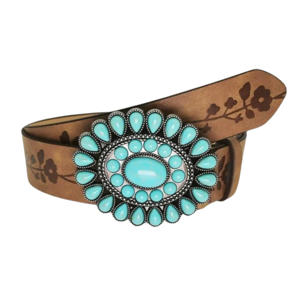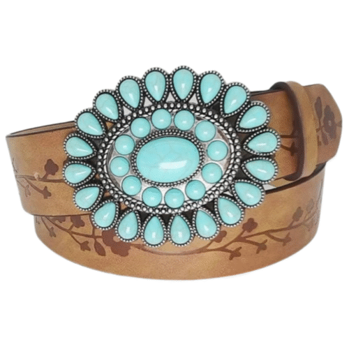Der perfekte Damenwesterngürtel mit türkisblauer, floraler Schnalle für jeden Anlass