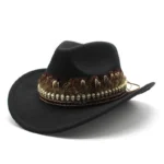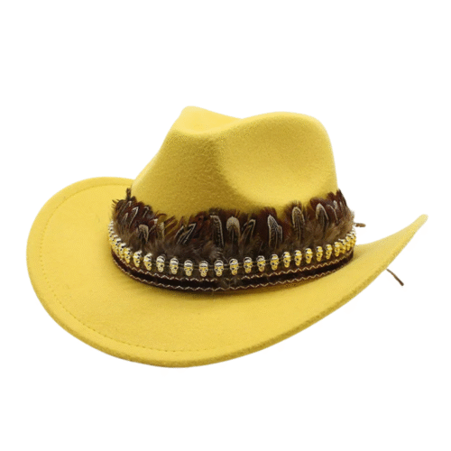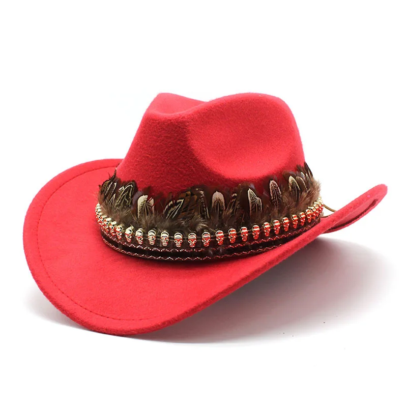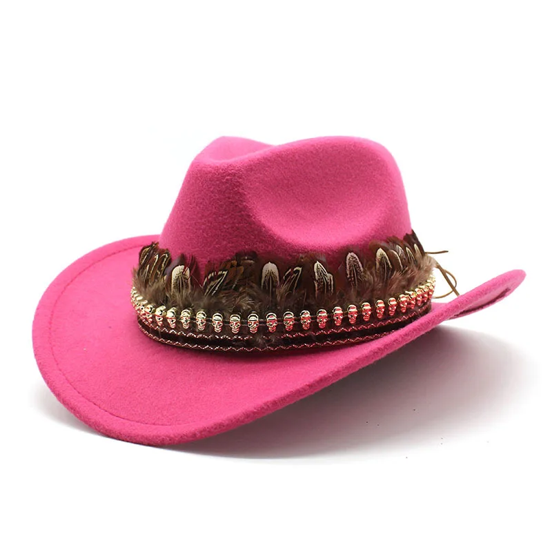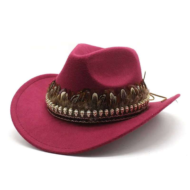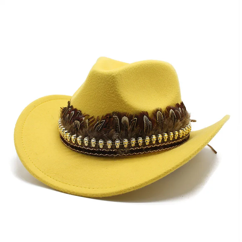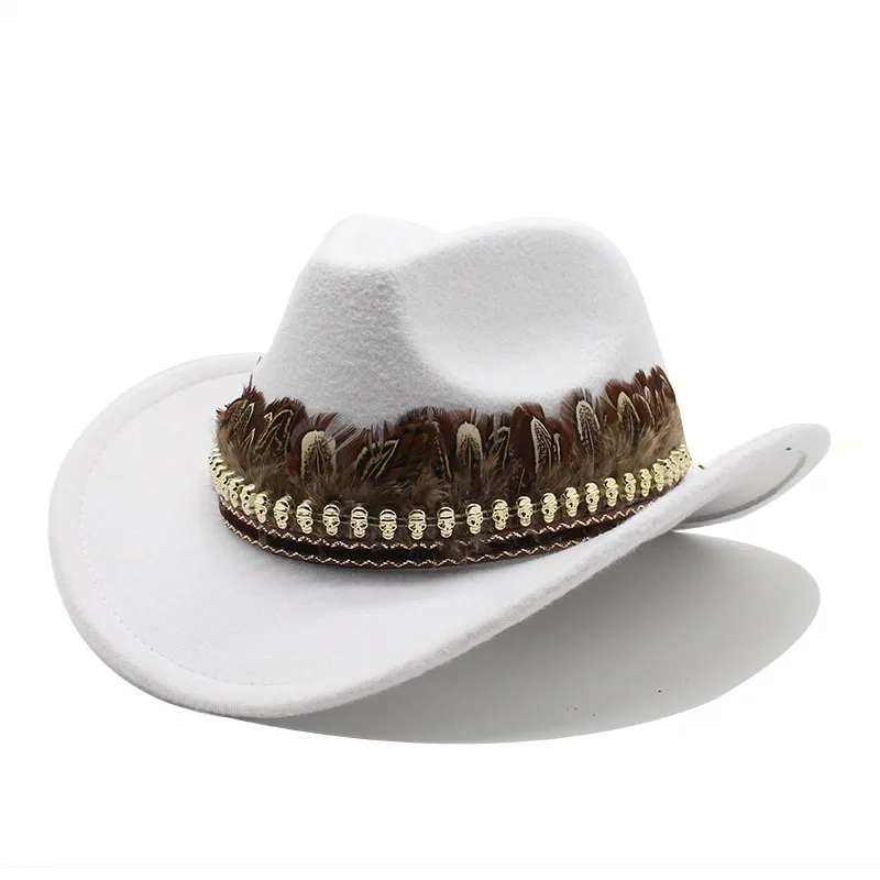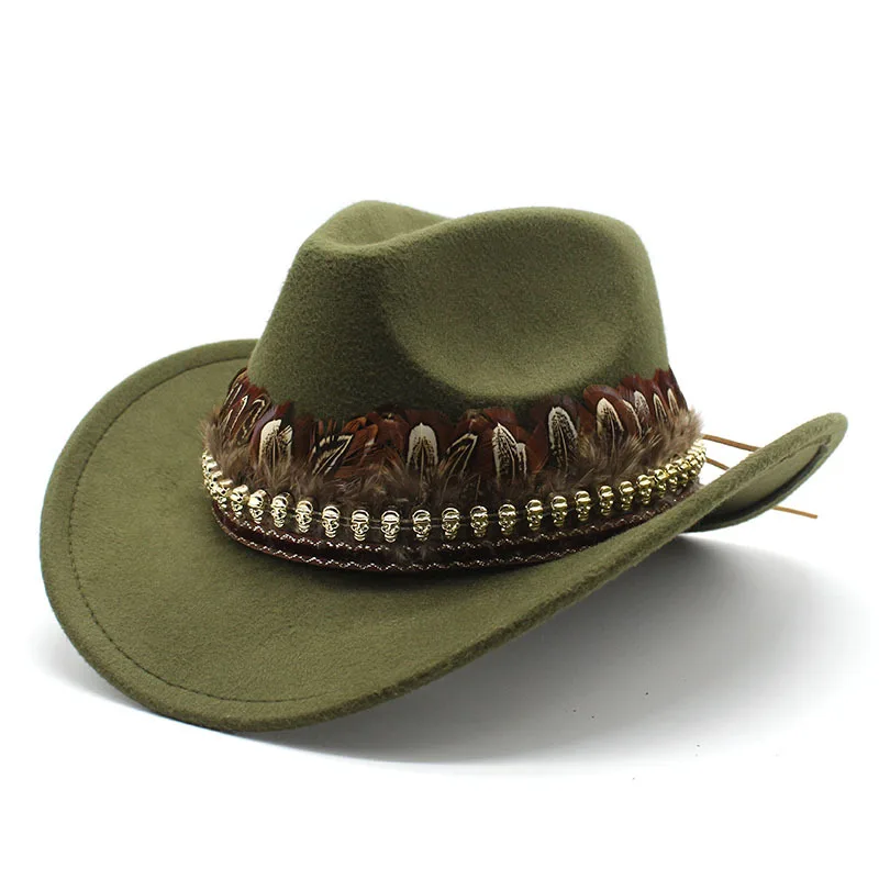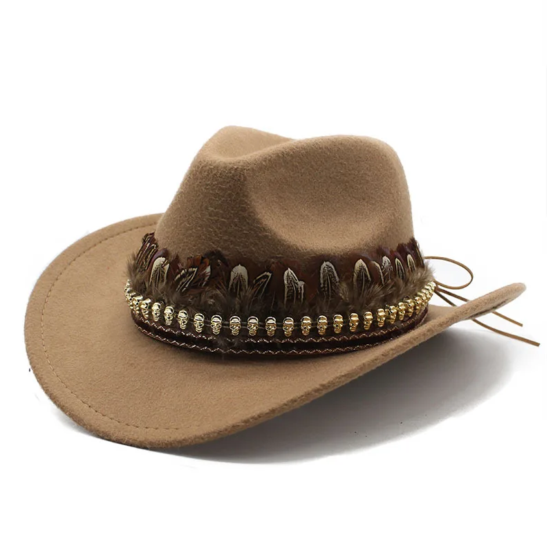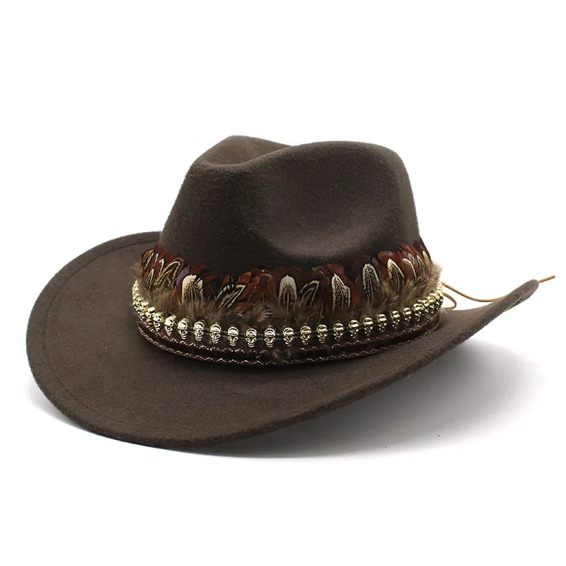 Verleihen Sie Ihrem Look das gewisse Etwas mit diesem einzigartigen Filzcowboyhut. Der markante Federbesatz und die goldenen Totenkopf-Akzente sorgen für einen unverwechselbaren Western-Charme, der jedes Outfit aufwertet. Neben seinem stilvollen Design bietet der breite Schirm zuverlässigen Sonnenschutz – perfekt für entspannte Tage im Freien oder urbane Abenteuer.