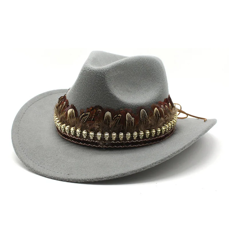 Eleganter Filzcowboyhut mit Federbesatz und Totenkopf-Details