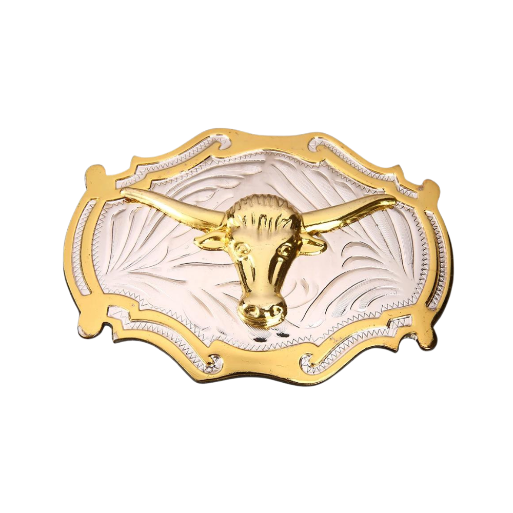 Die edle Gold- und Silberbeschichtung unterstreicht das luxuriöse und auffällige Finish der Schnalle, das sich dank des filigranen Longhorn-Designs und der schalenförmigen Umrandung von anderen Accessoires abhebt. Diese Details verleihen der Gürtelschnalle Tiefe und Charakter und machen sie zu einem echten Hingucker. Passend für Gürtel mit einer Breite von 3,8 bis 4 cm, ist diese vielseitige Schnalle eine ideale Erweiterung Ihrer Schmuck- und Accessoire-Kollektion und sorgt mit ihrem klassischen Western-Charme für echte Statement-Looks bei Cowboys und Cowgirls.