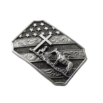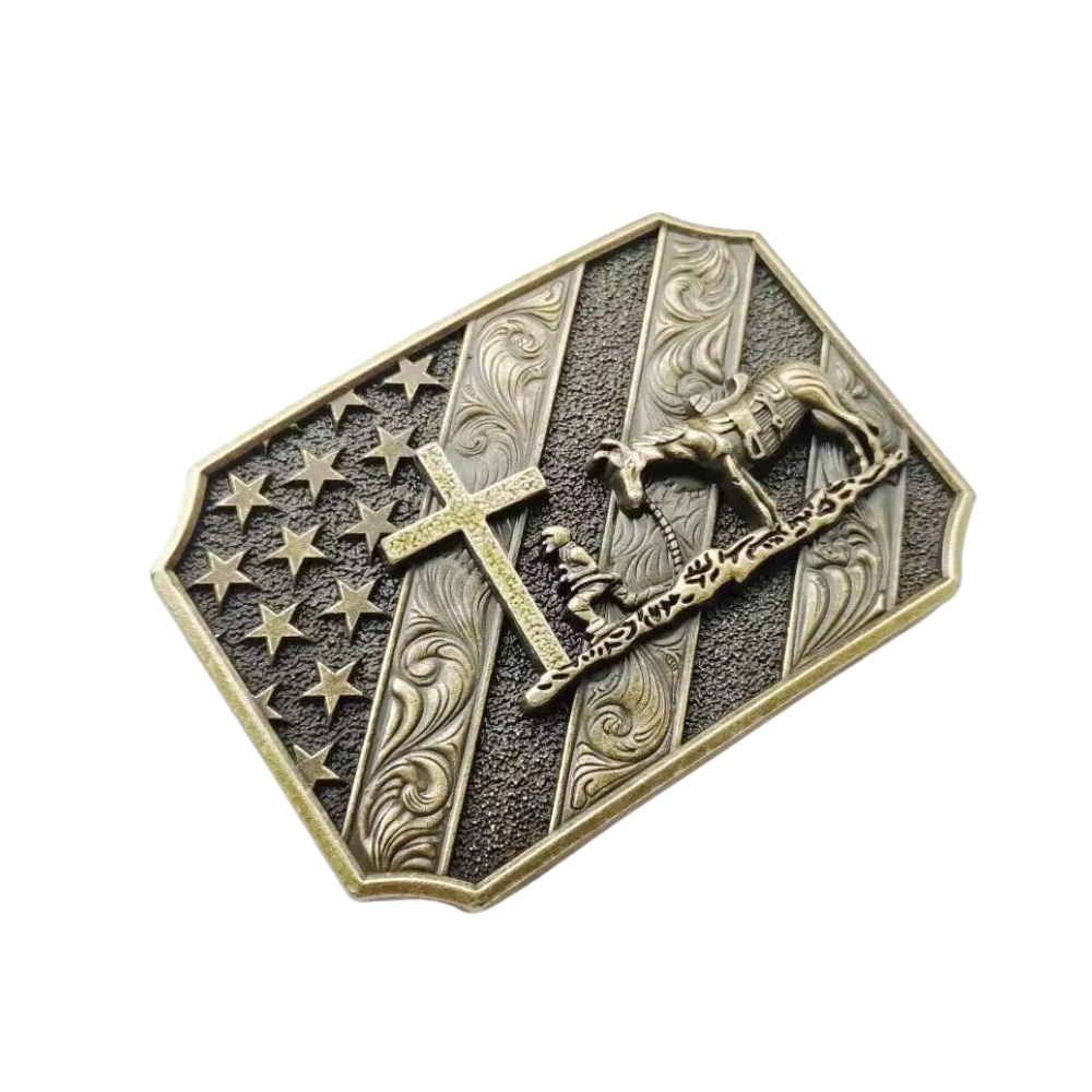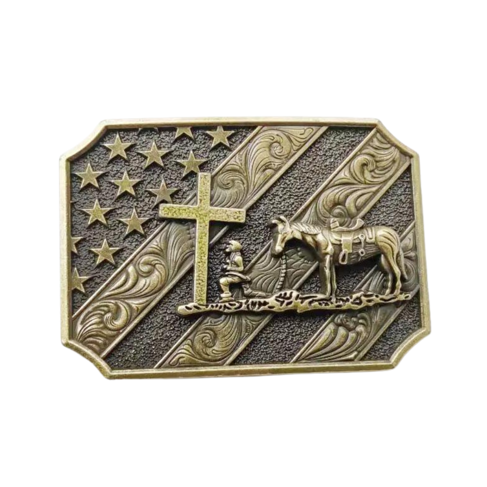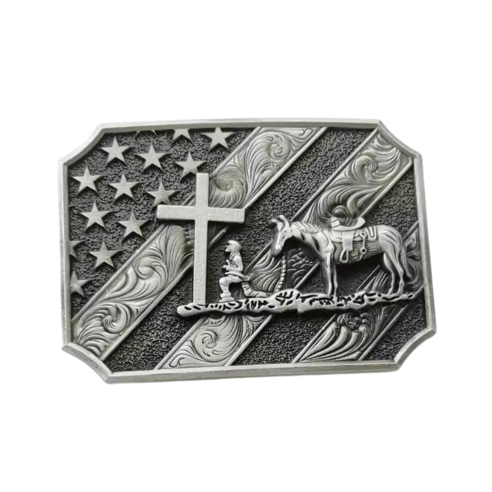 Diese außergewöhnliche patriotische Cowboy-Kreuz- und Pferdegürtelschnalle beeindruckt mit einem detailreichen Motiv, das einen knienden Cowboy am Kreuz darstellt – begleitet von seinem treuen Pferd und umrahmt von der amerikanischen Flagge. Dieses einzigartige Accessoire spricht alle an, die den authentischen Western-Stil, traditionelle Patriotik sowie kunstvolle Handwerkskunst lieben und schätzen.
