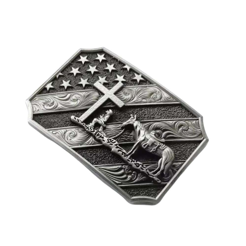 Elegante patriotische Cowboy-Kreuz- und Pferdegürtelschnalle für wahre Western-Fans