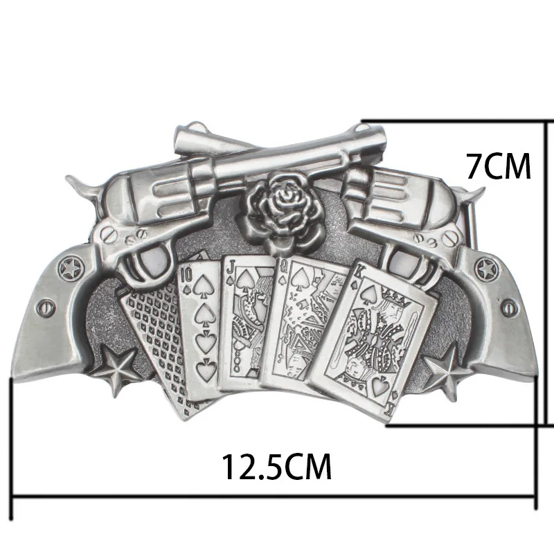 Gefertigt aus hochwertiger Zinklegierung, überzeugt diese Western-Gürtelschnalle nicht nur durch ihre Stabilität und Langlebigkeit, sondern auch durch ihre feinen Details. Die filigran gearbeiteten Revolver und Pokerkarten spiegeln den ungezähmten Geist des Wilden Westens wider und garantieren, dass die Schnalle den täglichen Beanspruchungen standhält. Ob beim Rodeo, auf dem Saloon-Abend oder beim Treffen mit Freunden – dieses Schmuckstück ist der ideale Blickfang für jeden Anlass.