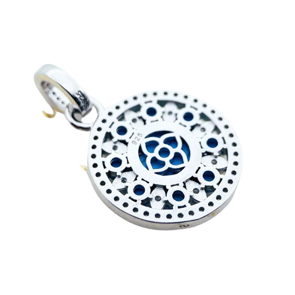 Dieser einzigartige Sterlingsilber-Anhänger verbindet den unwiderstehlichen Charme des Wilden Westens mit zeitloser Eleganz. Das markante Türkis-Mittelstück, das von funkelnden, kleineren Steinen umgeben ist, macht das Schmuckstück zu einem echten Blickfang – perfekt, um jedem Outfit einen Hauch von westlichem Flair zu verleihen.