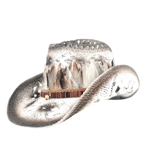 Strohcowboyhut mit boho und federakzenten