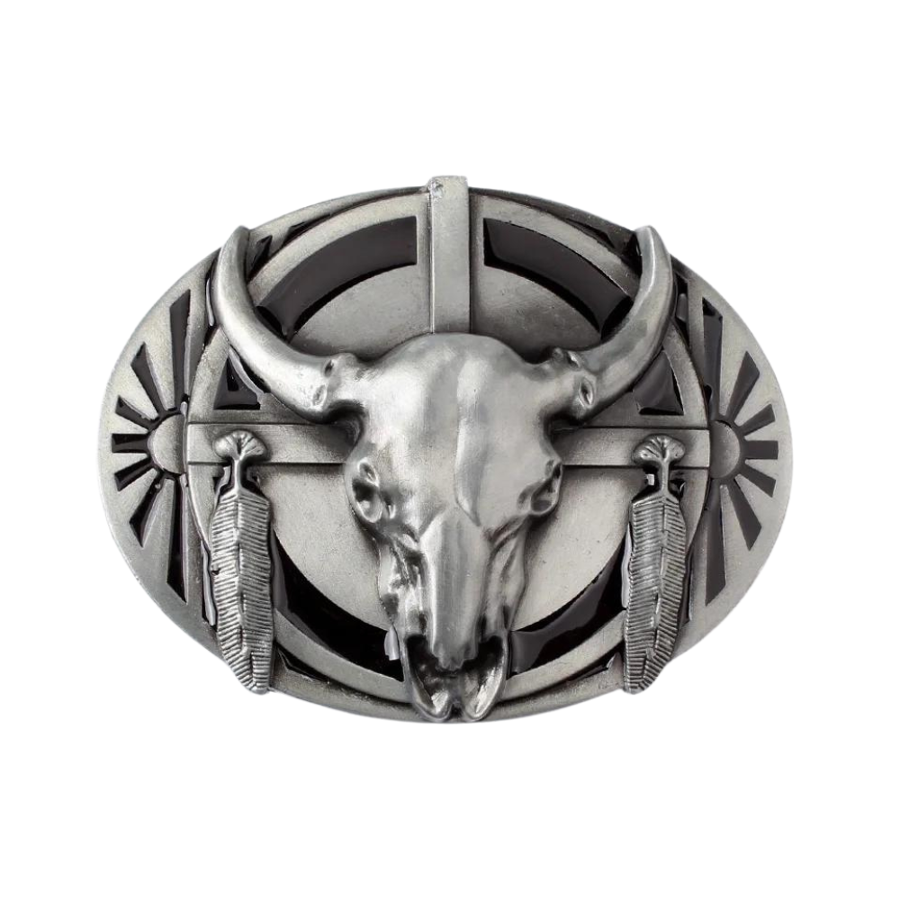 Markante Western-Stierschädel-Cowboygürtelschnalle mit Federn