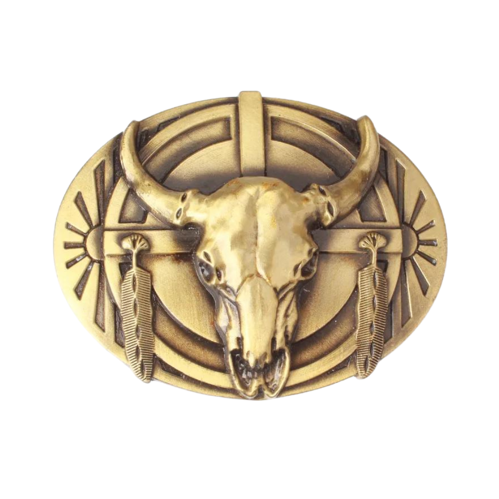 Western-stierschädel-cowboygürtelschnalle mit federnakzenten - gold