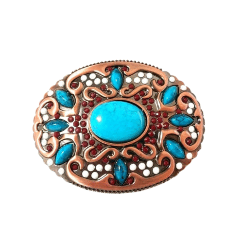 Wagemutige Gürtelschnalle in Türkis und Kupfer mit roten Edelsteinakzenten